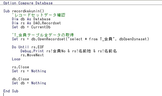 Debug.Print rs!会員No & rs!名前姓 & rs!名前名