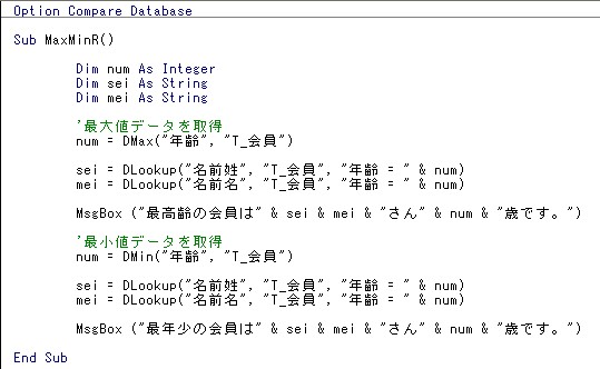 DMax関数でテーブル内に登録されている年齢の数値の最大値を取得し、取得したデータでDLookup関数を使用しレコードデータを取得しています。