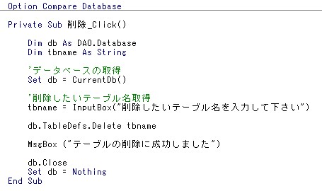 上の例ではINPUTBOXを利用して削除したテーブル名を入力させ削除をおこなっています。